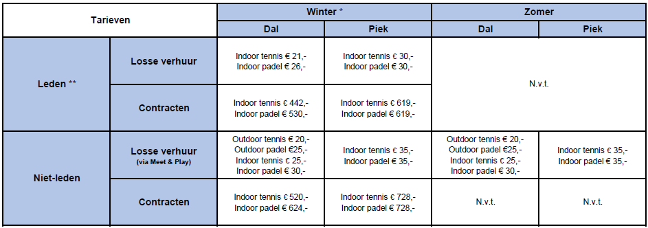 ** Leden krijgen 15% korting op zowel de losse verhuur als op contracten. Dit geldt alleen als alle (4) spelers lid zijn.