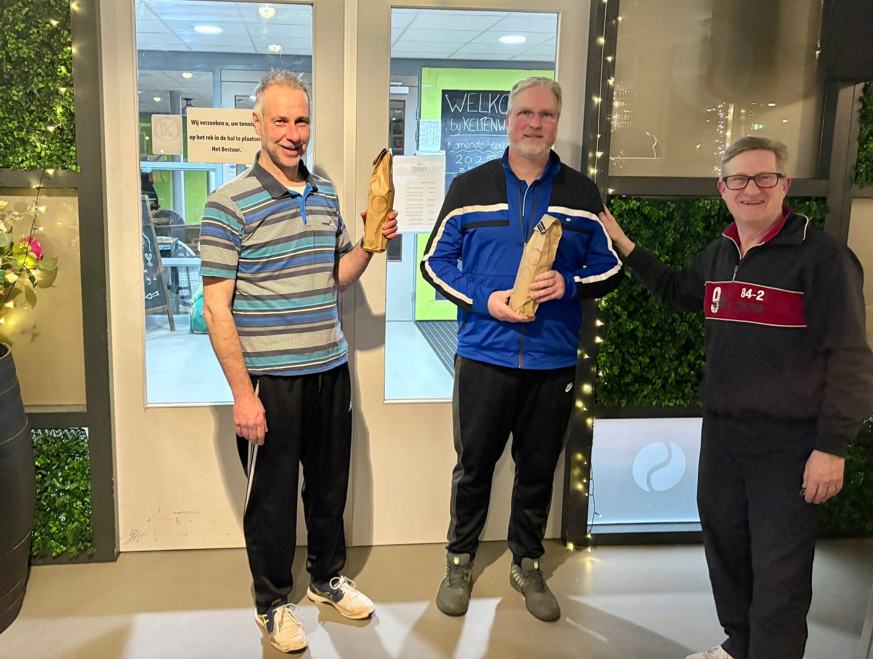 Als afsluiting van de wintercompetitie was er een finale voor de sterkste vier tennissers (nummer 1 + nummer 4 tegen de nummers 2+3). Deze wedstrijd werd dus gewonnen door Berry en Titus. Op de foto heeft medeorganisator Bernie van Welt de prijs aan Berry (links) en Titus overhandigd. Er was ook nog een troostfinale (nrs 5+8 tegen nrs 6+7). Hierin waren Edward en Hidde iets sterker dan Bernie en Thijs (6-5).