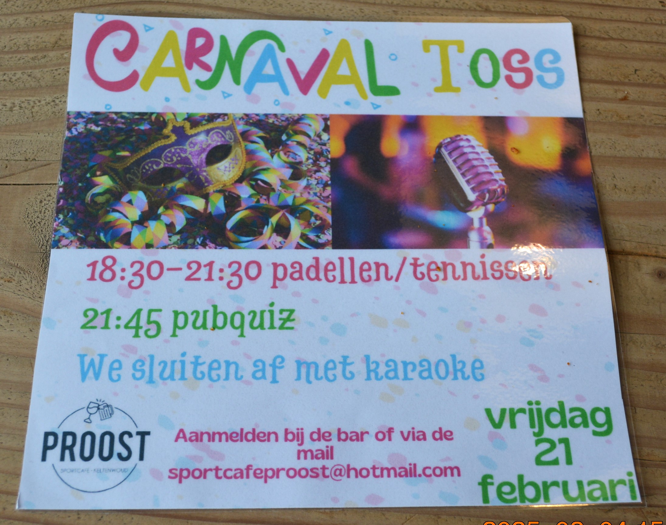 Sportcafé Proost komt weer met de jaarlijks terugkerende toss, deze keer op vrijdag 21 februari. Er wordt gepaddeld en getennist van 18:30 tot 21:30 uur. Dit jaar staat het toernooi helemaal in het teken van carnaval en wordt het na het tennissen/padellen een gezellige avond, beginnend met een pubquiz.