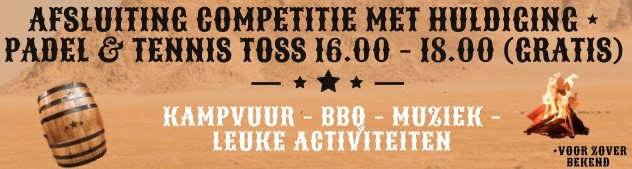 Mocht je geen competitie (meer) spelen, maar het wel leuk vinden om nog even te tennissen of te padellen, kom dan van 16.00-18.00 uur naar de toss voor tennis of padel. Iedereen is welkom, je kunt gratis meedoen en wordt ingedeeld op niveau. Aansluitend wordt om 18.00 uur gestart met de BBQ. De kosten hiervoor zijn € 15,00 per persoon. In de avonduren vindt de huldiging plaats en zijn er diverse spelletjes te spelen waarmee je kans maakt op leuke prijzen. We steken het kampvuur aan, draaien sfeervolle muziek en maken er een gezellige avond van. Dus Proost vraagt of jij er dan ook bij bent! Aanmelden voor toss en/of barbecue kan tot 1 juni aan de bar in het clubhuis of via een emailbericht naar [email protected].