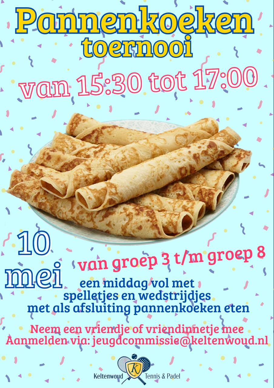 Op woensdagmiddag 10 mei kan de jeugd weer meedoen aan het jaarlijkse pannenkoekentoernooi. Dat wordt lekker smullen na een sportactiviteit met spelletjes en wedstrijdjes op onze tennis- en padelbanen. Aanvang half 4; afsluiting na het pannenkoeken eten om 5 uur.