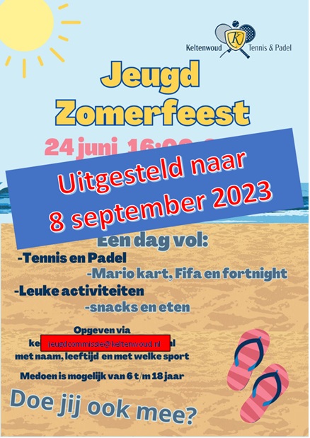 Het geplande zomerfeest bij de jeugd is uitgesteld naar 8 september. Die vrijdagmiddag zullen er vanaf 16.00 uur allerlei activiteiten worden georganiseerd voor alle jeugdleden van 6 tot en met 18 jaar! Je kunt partijtjes Tennis en Padel spelen; de banen houden we voor jullie vrij en neem je team en trainingsmaatjes mee! Daarnaast is er meer te doen als FIFA 23, Mario Kart en verrassingsactiviteiten! Ook zorgt de jeugdcommissie voor eten, drinken en andere versnaperingen. Doe je mee? Je kunt je opgeven door een mail te sturen naar [email protected].