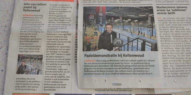 De aankondiging dat John van Lottum op 1 december een demonstratiewedstrijd bij Keltenwoud komt padellen heeft ook al de krant gehaald. Het stond ook al in de vorige Nieuwsflits: aanstaande donderdagavond van 18.15 tot 18.50 uur staat dit te gebeuren. Belangstellenden zijn van harte welkom.