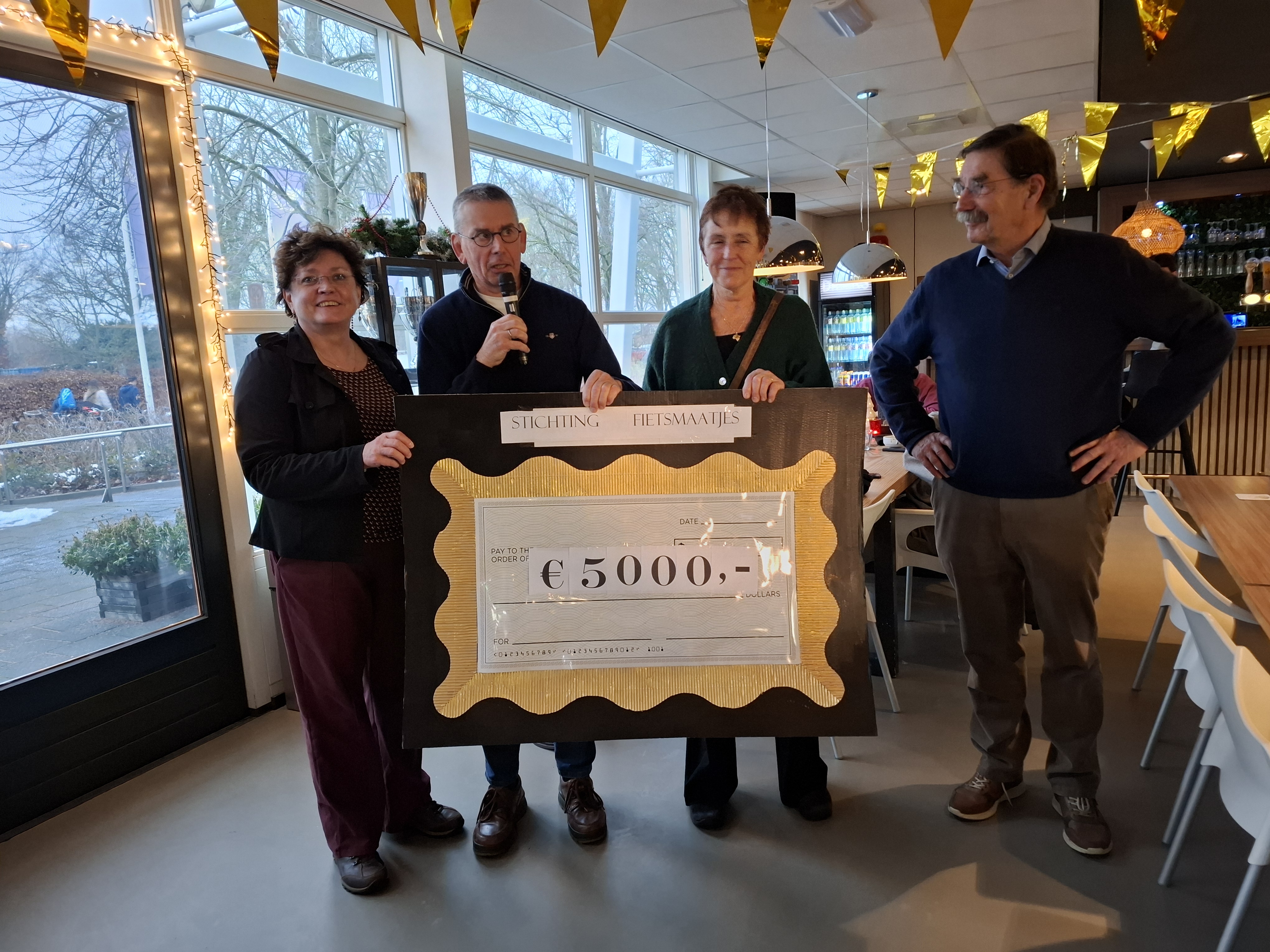 De vertegenwoordigers van de Stichting Fietsmaatjes Gelderse Vallei, Tjitze Smit, Lineke van Dongen en Frank Schellekens ontvingen van Karen van ‘t Woud een cheque voor het grote bedrag van € 5.000. Het hele jubileumjaar 2025 verzamelden de leden van Keltenwoud geld in voor de Fietsmaatjes.