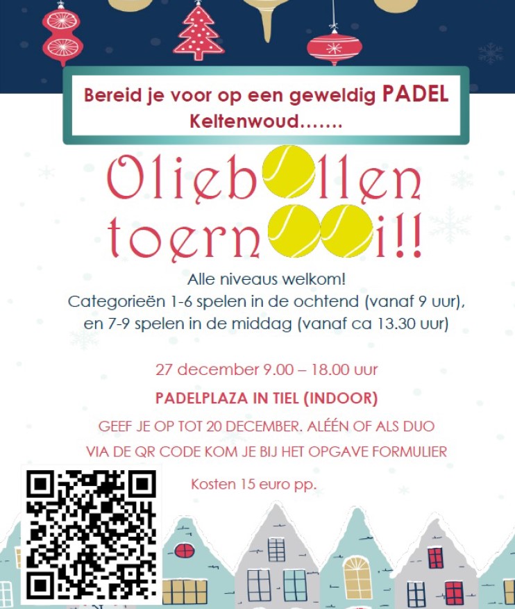 Na een succesvolle eerste editie vorig jaar organiseert de padelcommissie van Keltenwoud ook dit jaar weer het Padel Oliebollentoernooi. Daarvoor wijkt de commissie uit naar Padelplaza in Tiel. Op vrijdag 27 december zijn de banen daar open voor onze toernooideelnemers en staan de oliebollen klaar.