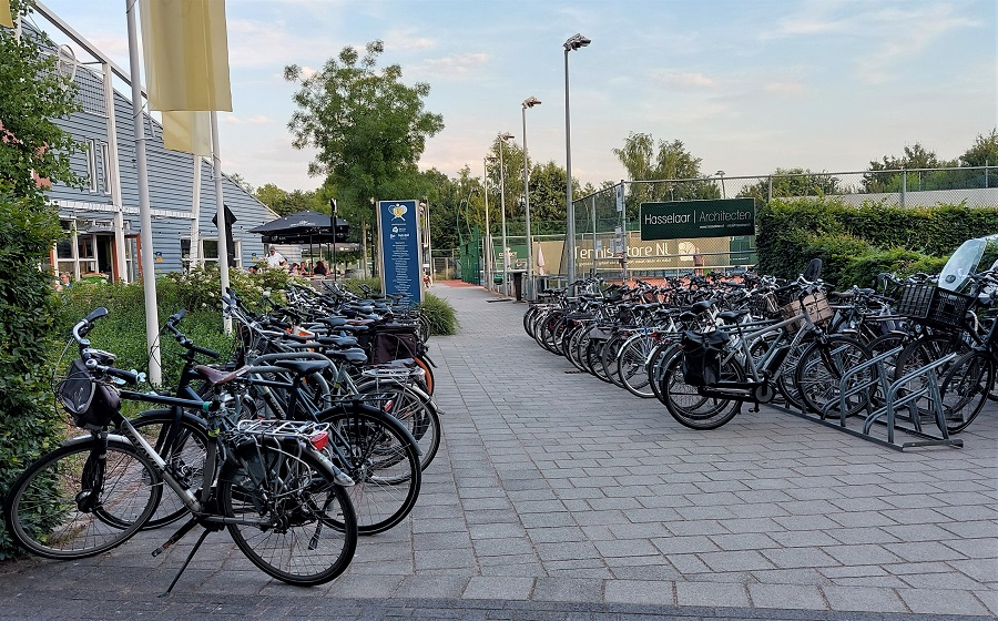 Via Markplaats hebben we een aantal fietsenrekken kunnen kopen. Die fietsenrekken lagen eerst op de NP-plaats, maar dat was toch niet de juiste ligging, want die plaats moet vrij gehouden worden voor de brandweer. Nu liggen de rekken in twee rijen tegen elkaar in het midden van het pad naar de banen en de hal (foto). We gaan kijken hoe deze opstelling werkt.
