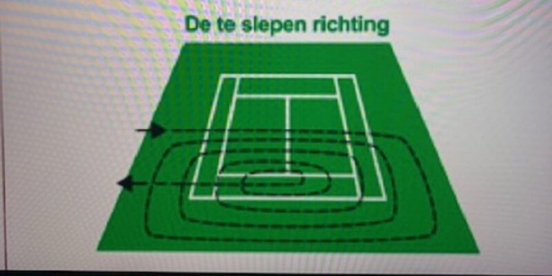 Die ophopingen aan de baselines doen het speelveld in het midden “verschralen” (te weinig infill) waardoor de top van het kunstgras als het ware boven het maaiveld uit piekt. Wanneer dat het geval is, slijt het kunstgras onnodig. Je zou dan zeggen strooi meer infill ! Dat is de oplossing ook niet want dan wordt de baan te traag, blijft bij vochtig weer te nat, wordt bij vorst te glad. Kortom het is zaak de juiste hoeveelheid infill op het speelveld te houden door op de correcte manier te slepen en dat is in een spiraal van buiten naar binnen. In het midden de mat op tillen en langs het hek leggen. Dus niet naar de hoeken trekken want dan ontstaan die hopen met vuil die moeten worden afgevoerd. Kortom op de juiste manier en na ieder spel correct slepen voorkomt onnodige slijtage en draagt bij aan de spelbeleving want de balstuit is ook gelijkmatig. Dat geldt voor alle banen tennis- en padelbanen en de banen in de hal. Want wat voor kunstgras geldt buiten geldt in de zelfde mate voor het tapijt binnen. Een instructie voorbeeld van hoe te slepen komt bij de banen te hangen.