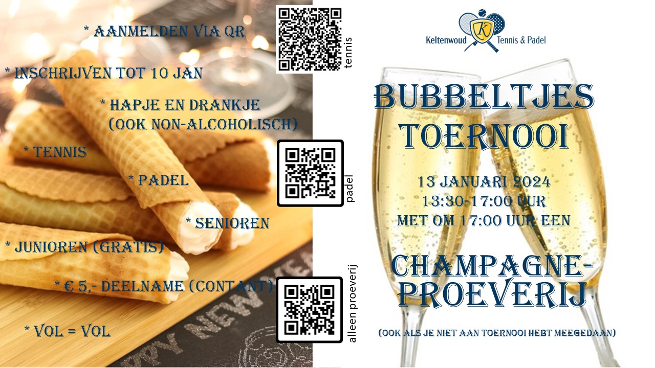 Er zijn hapjes, drankjes en een heuse champagneproeverij! Ook als je ’s middags niet kunt meedoen aan het toernooi, ben je om 17.00 uur van harte welkom bij de proeverij. Meld je met een van de QR-codes aan. Als je je aanmeldt voor een toernooi, ben je automatisch aangemeld voor de proeverij. Toernooi is voor jong en oud!