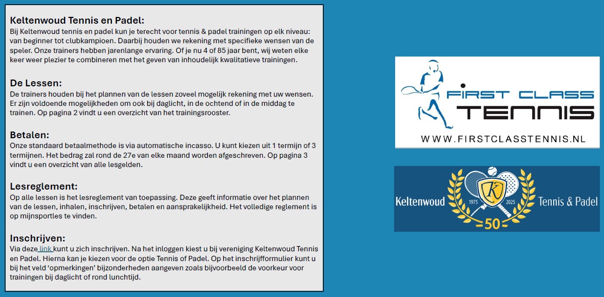 Bij Keltenwoud Tennis en Padel kun je terecht voor tennis- en padeltrainingen op elke leeftijd en niveau, van beginner tot clubkampioen. Daarbij houden ze rekening met specifieke wensen. Hun trainers hebben jarenlange ervaring. De nieuwe lessen ‘Zomerseizoen’ beginnen in de week van 30 maart.