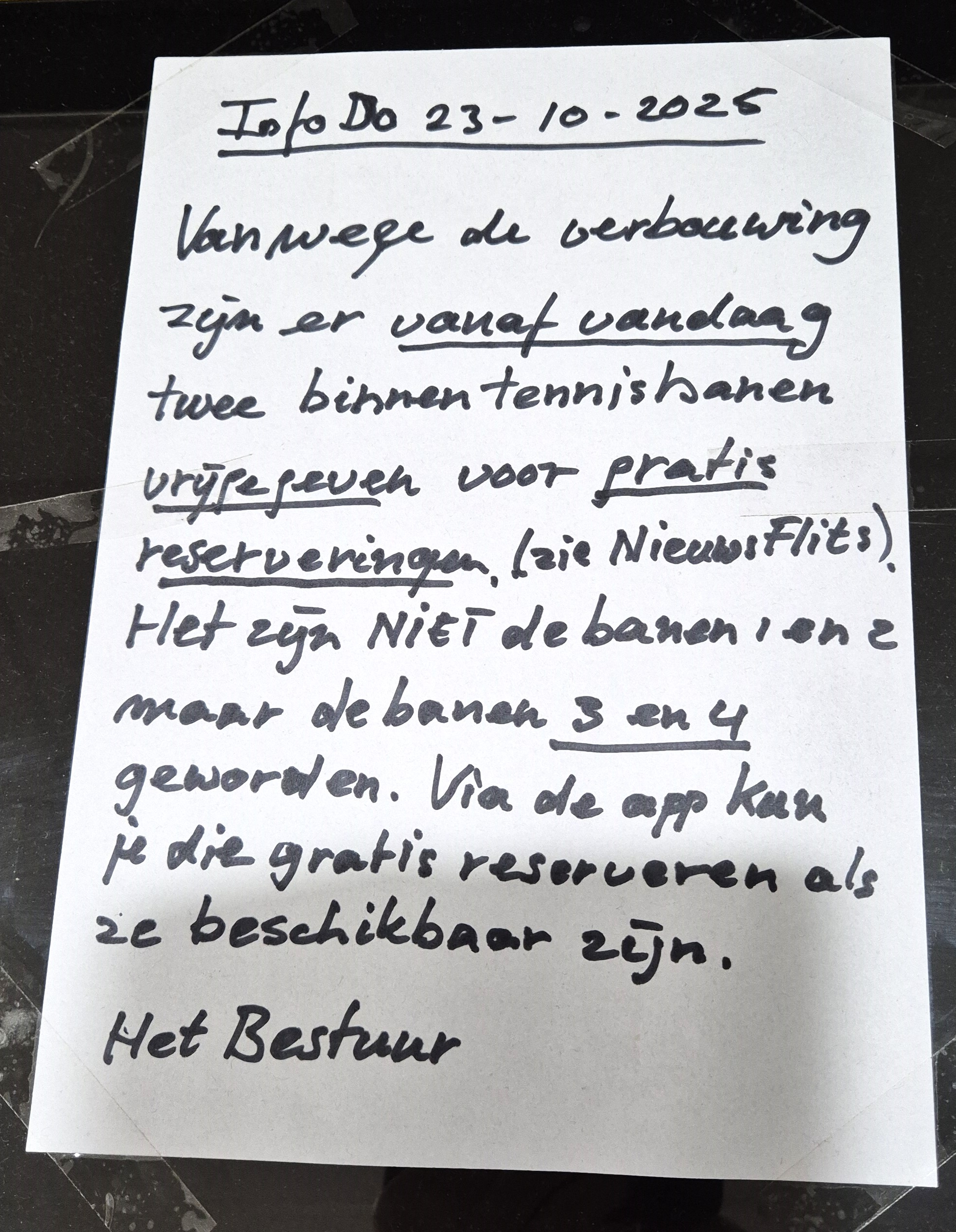 Door deze werkzaamheden zijn de padelbanen 4 en 5 tijdelijk overdag niet te bespelen. De tennisbanen 9 en 10 zijn al afgeblokt en als een soort compensatie daarvoor mogen leden desgewenst gratis op de banen 3 en 4 in de tennishal spelen. Maar natuurlijk alleen als deze banen niet verhuurd zijn. In de vorige Nieuwsflits berichtten wij over de halbanen 1 en 2, maar dat is dus 3 en 4. De ervaring leert dat daar door de bank genomen meer vrije speeluren zijn. In de entreehal van ons clubhuis is daarvan mededeling gedaan (foto). Bij het online reserveren van een baan, merk je vanzelf of dat een vrije speeltijd is.